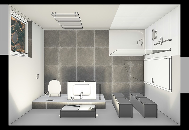 • Begehbare Dusche mit Glasseitenwand und Stahl-Duschwanne